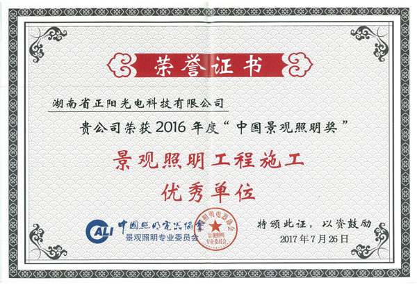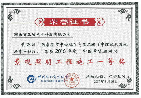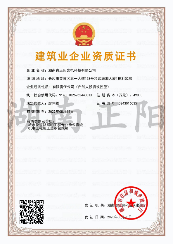 湖南省正陽光電科技有限公司是一家從事亮化工程及大型燈光藝術(shù)的設(shè)計、制作、安裝和維護于一體的專業(yè)化公司。公司資質(zhì)齊全、管理嚴(yán)謹(jǐn)、技術(shù)先進、實力雄厚,取得了城市及道路照明工程專業(yè)承包壹級資質(zhì)、照明工程設(shè)計專項甲級資質(zhì)、機電工程施工總承包貳級資質(zhì)、施工勞務(wù)等資質(zhì),榮獲“重質(zhì)量·守誠信”示范企業(yè)。